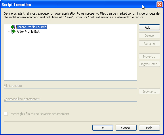 On the Script Execution dialog box, which is opened by clicking Script Execution in the More Options list on the Profile Requirements page, you can choose to include scripts that must execute for your application to run properly. From this dialog box, you can view and manage all of the Before Profile Launch and After Profile Exit script files you are including with your Citrix profile.