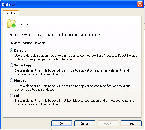 FullYou would use Full isolation when a ThinApp application needs to run on a machine where earlier or later versions of the same application are either installed or were not uninstalled correctly. For directories and registry keys that have Full isolation, the ThinApp application will not be aware of any host computer file that might exist, and it sees only virtual files and registry keys at fully isolated locations.
