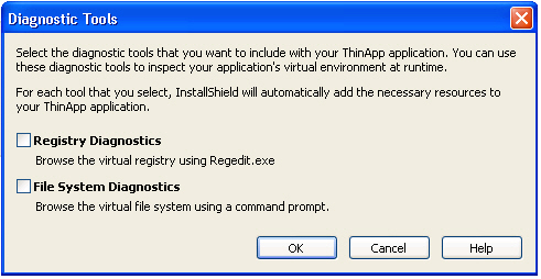 - If you want to include the Windows Command Prompt application with your ThinApp application so that you can browse the virtual file system at runtime from within the virtual environment, select the File System Diagnostics option.