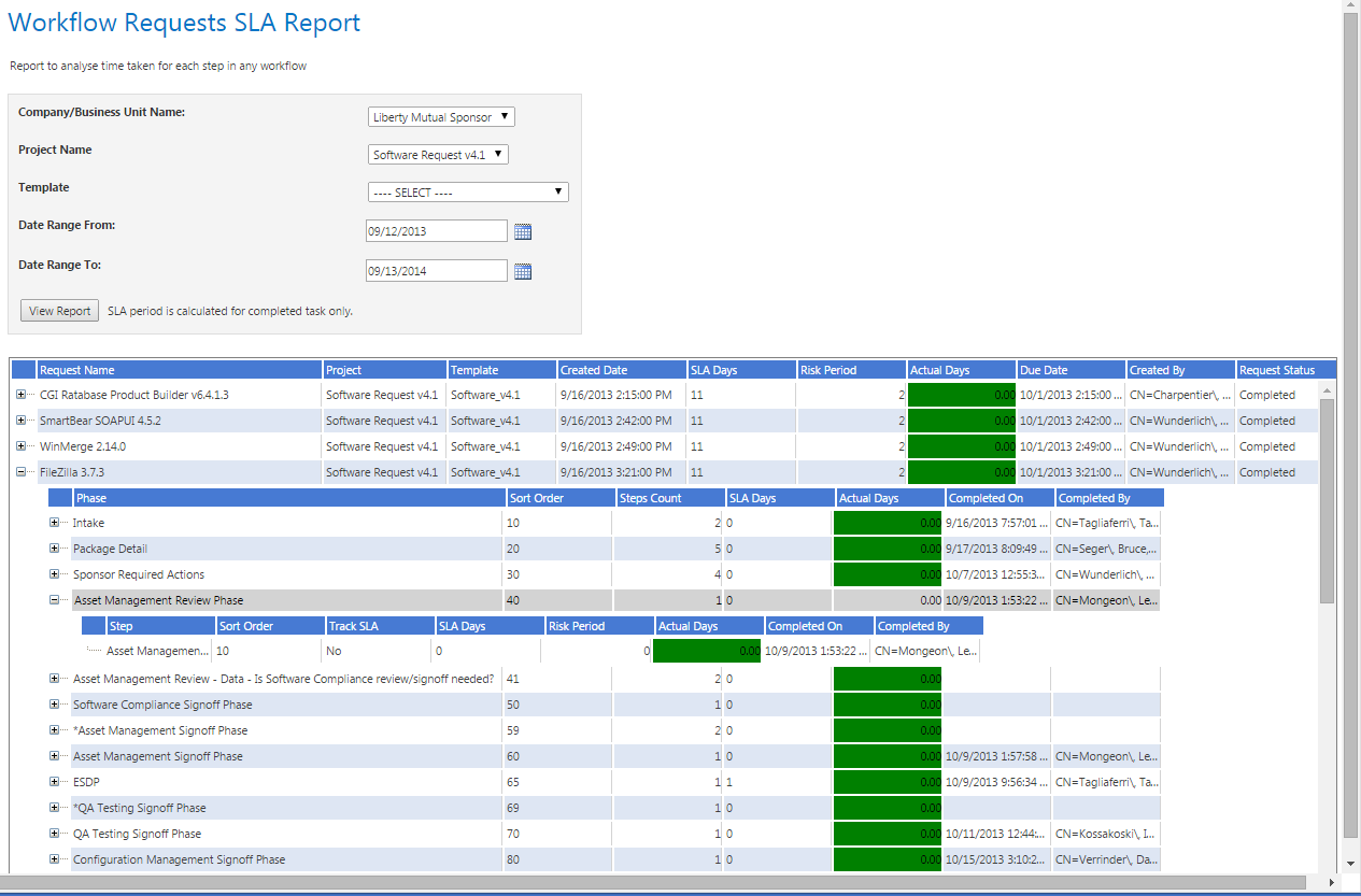 In the Request Detail Report, workflow requests are listed, along with summary SLA information for all phases in that workflow request. Use the plus signs to expand the listing to view the SLA data for workflow phases and steps in a particular workflow request.