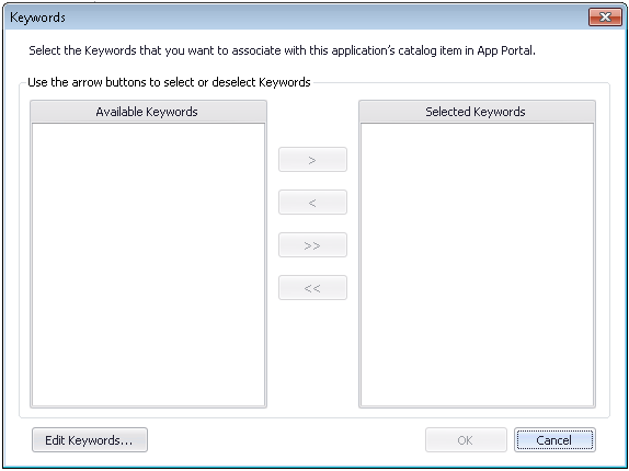 - To add a keyword to an application, select the keyword in the Available Keywords list and then click the right arrow to move it to the Selected Keywords list.