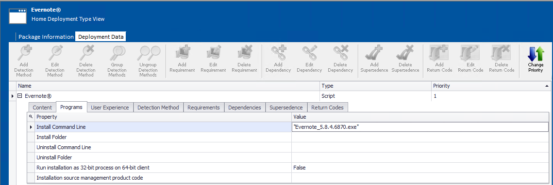 The Program subtab of the Deployment Data tab of the Home Deployment Type View lists command line parameters for package installation and uninstallation.