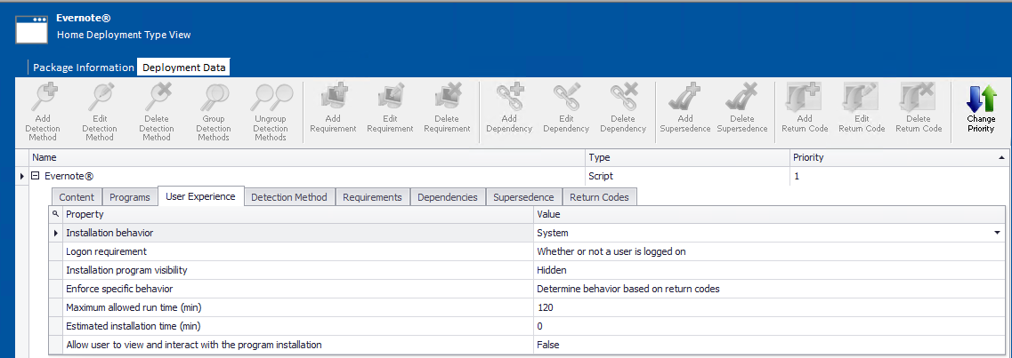 The User Experience subtab of the Deployment Data tab of the Home Deployment Type View lists parameters relating to the user experience during installation.