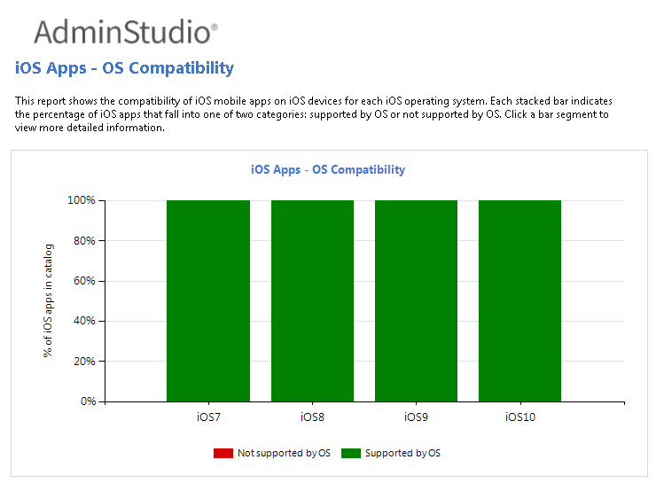 iOS/Android App - OS CompatibilityShows the compatibility of mobile apps on each of its operating systems. Each stacked bar indicates the percentage of mobile apps that fall into one of two categories: supported by OS or not supported by OS. Click on a bar segment to view OS Compatibility detail reports.