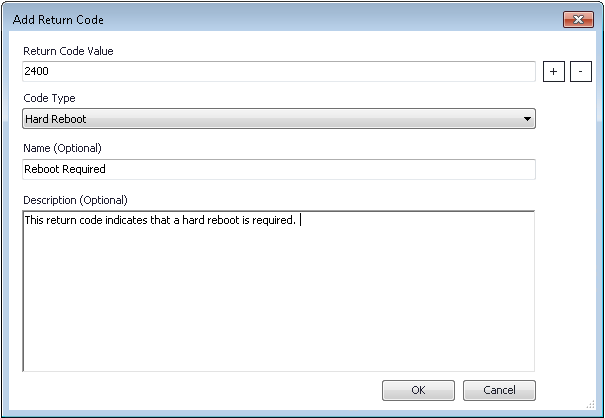 | Return Code Value | Enter a unique value. The following return codes are populated by default during import: 0 —Success (no reboot) 1707 —Success (no reboot) 3010 —Soft Reboot 1641 —Hard Reboot 1618 —Fast Retry When you are editing an existing return code, this field cannot be edited. |