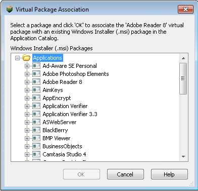 If you right-click on a virtual package in the Application Catalog tree and then select Associate Package from the shortcut menu, the Virtual Package Association dialog box opens, listing all of the Windows Installer packages in the Application Catalog. Select the virtual package’s source Windows Installer package and click OK. The Windows Installer package will now be listed in the Associations field on the Package Information tab of the Home Deployment Type View for the virtual package.