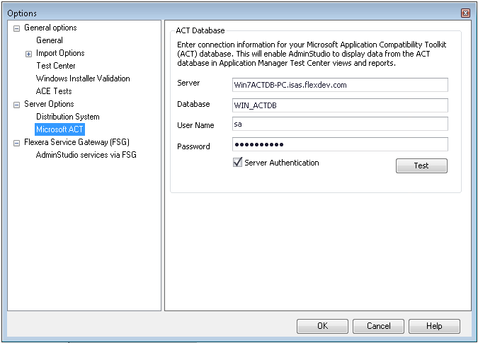 On the Server Options / Microsoft ACT tab of the Application Manager Options dialog box, enter connection settings for your Microsoft ACT (Application Compatibility Toolkit) database. This will enable AdminStudio to display data from the ACT database in Application Manager Analyze views and reports.
