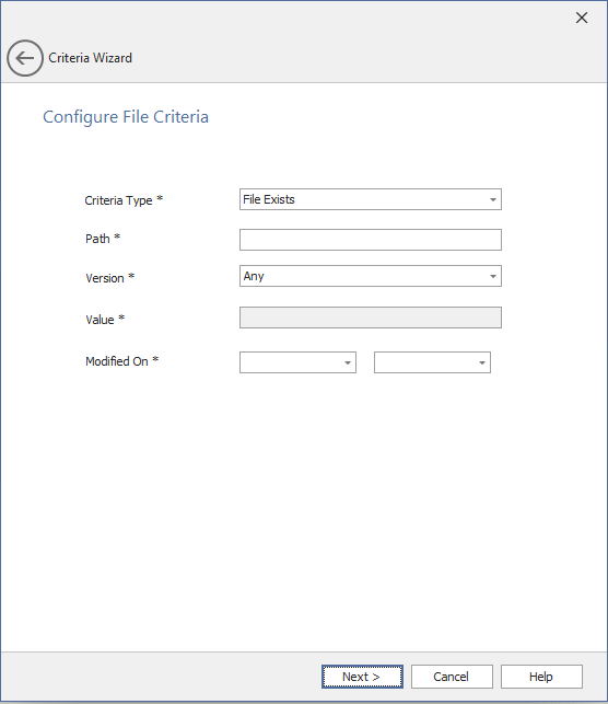 Criteria TypeSelect one of the following Criteria Type: File Exists File does not exist