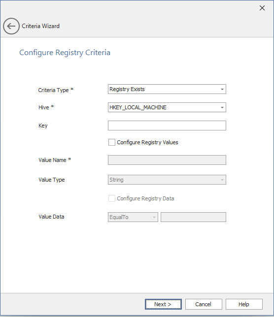| Criteria Type | Select one of the following Criteria Type: Registry exists Registry does not exist |