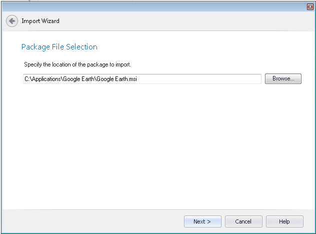 When you select Single application on the Source panel of the Import Wizard, the Package File Selection panel opens, prompting you to select the package that you want to import.