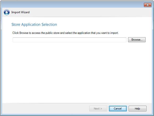 On the Store Application Selection panel, which opens when you select Link to a public store app on the Source panel and select a public store type on the Public Store Selection panel, you are prompted to browse to the public store app that you want to insert a link to.