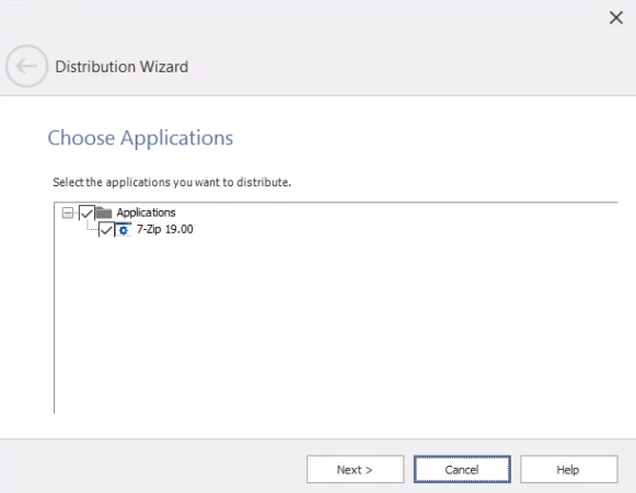 - The Choose Applications panel under Distribution Wizard opens. Select the applications, and then click Next.