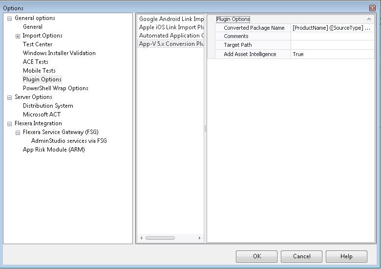 - In the middle pane, select App-V 5 Conversion Plugin. The App-V 5.0 conversion options are displayed in the right pane.