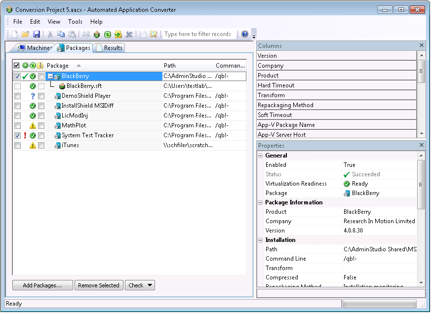 On the Packages tab, you select the packages that you want to virtualize/repackage. On this tab, you can also set package properties and view package status.
