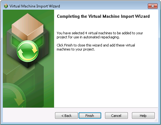 The Virtual Machine Import Wizard Complete panel lists the number of virtual machines you have added to your project for use in automated repackaging.