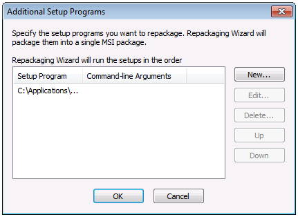 This dialog box, which is accessed by clicking the Edit Setup List button on the Collect Product Information Panel of the Repackaging Wizard, displays a list of additional setup programs you want to add to the final Windows Installer package.
