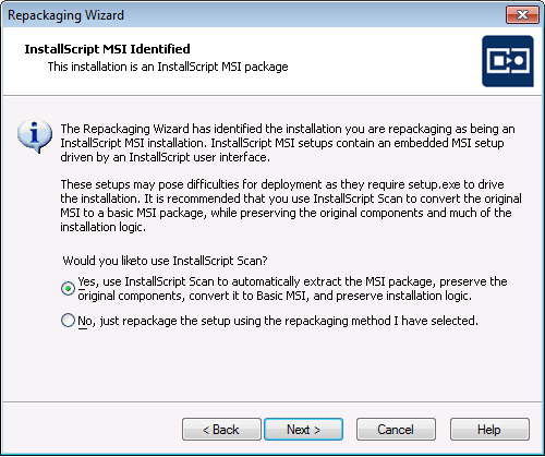This panel opens if the Repackaging Wizard identifies an installation as an InstallScript MSI installation created with InstallShield Editor, InstallShield DevStudio, or InstallShield Developer.