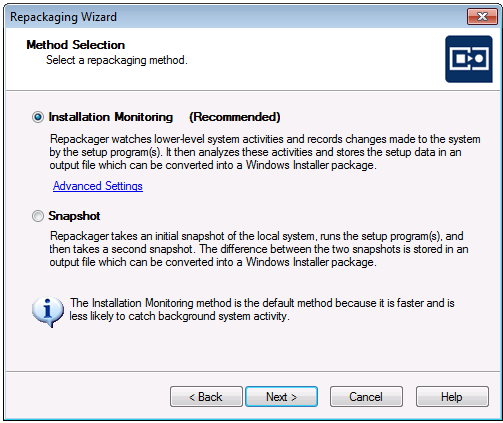 Installation MonitoringInstallation Monitoring watches all activities generated by an installation, and then determines the files, .ini files, registry entries and shortcuts that should be included in the generated Windows Installer package. Installation Monitoring is significantly faster than the Snapshot repackaging method. If there are services running on the machine that have nothing to do with the installation being repackaged, click the Advanced Settings link to open the Excluded Processes Dialog Box, where you can choose to exclude those processes. The Installation Monitoring Method is included with AdminStudio Professional and Enterprise Editions. If you know that the installation that you are capturing is from a self-extracting .exe file and if you want to use the Installation Monitoring method, you should click Advanced Settings and add the name of that .exe file to the excluded processes list.