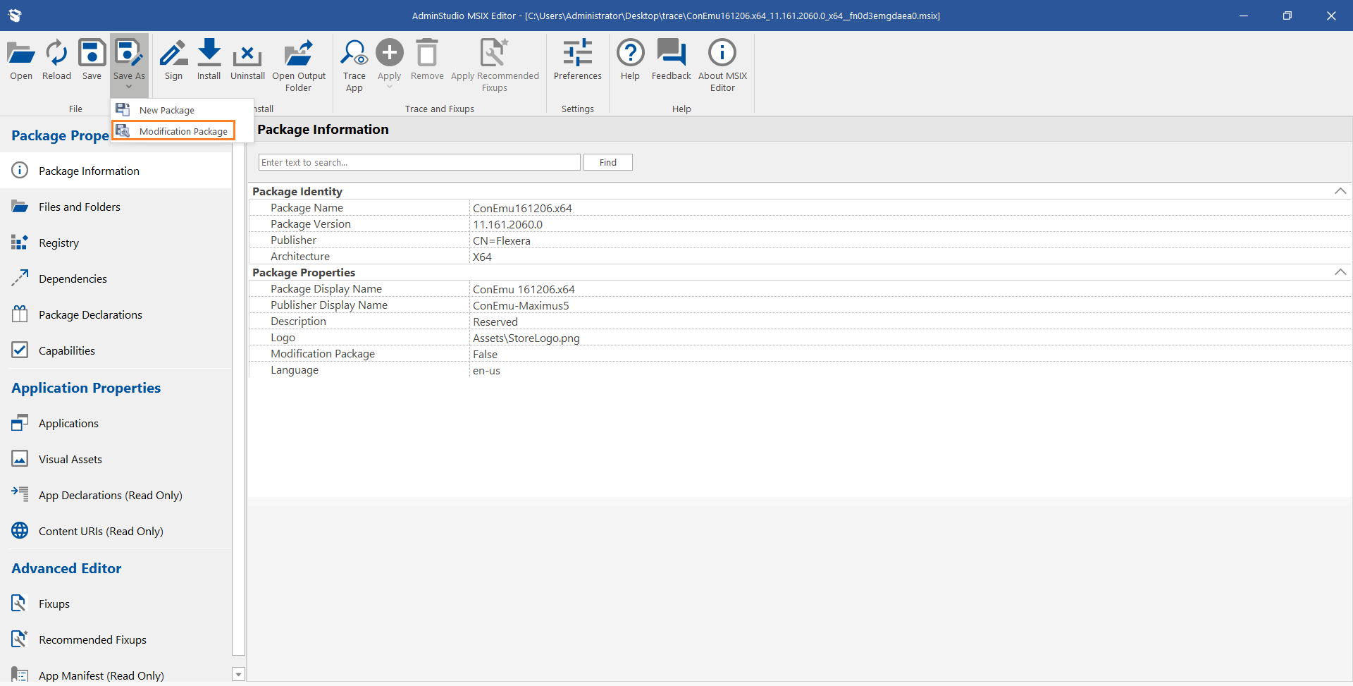 After saving, you can see the modification package loaded in the MSIX Editor.