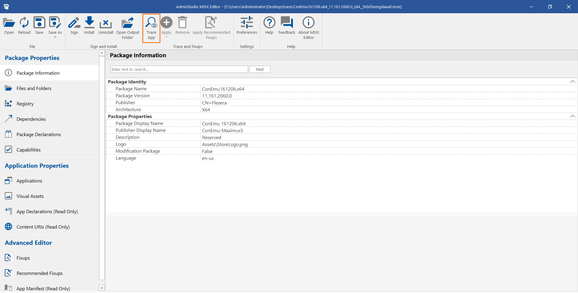 2. Click on the Trace App button in MSIX Editor ribbon. ![](/images/MSIX Editor_TraceAppNewImage_New1.png)
