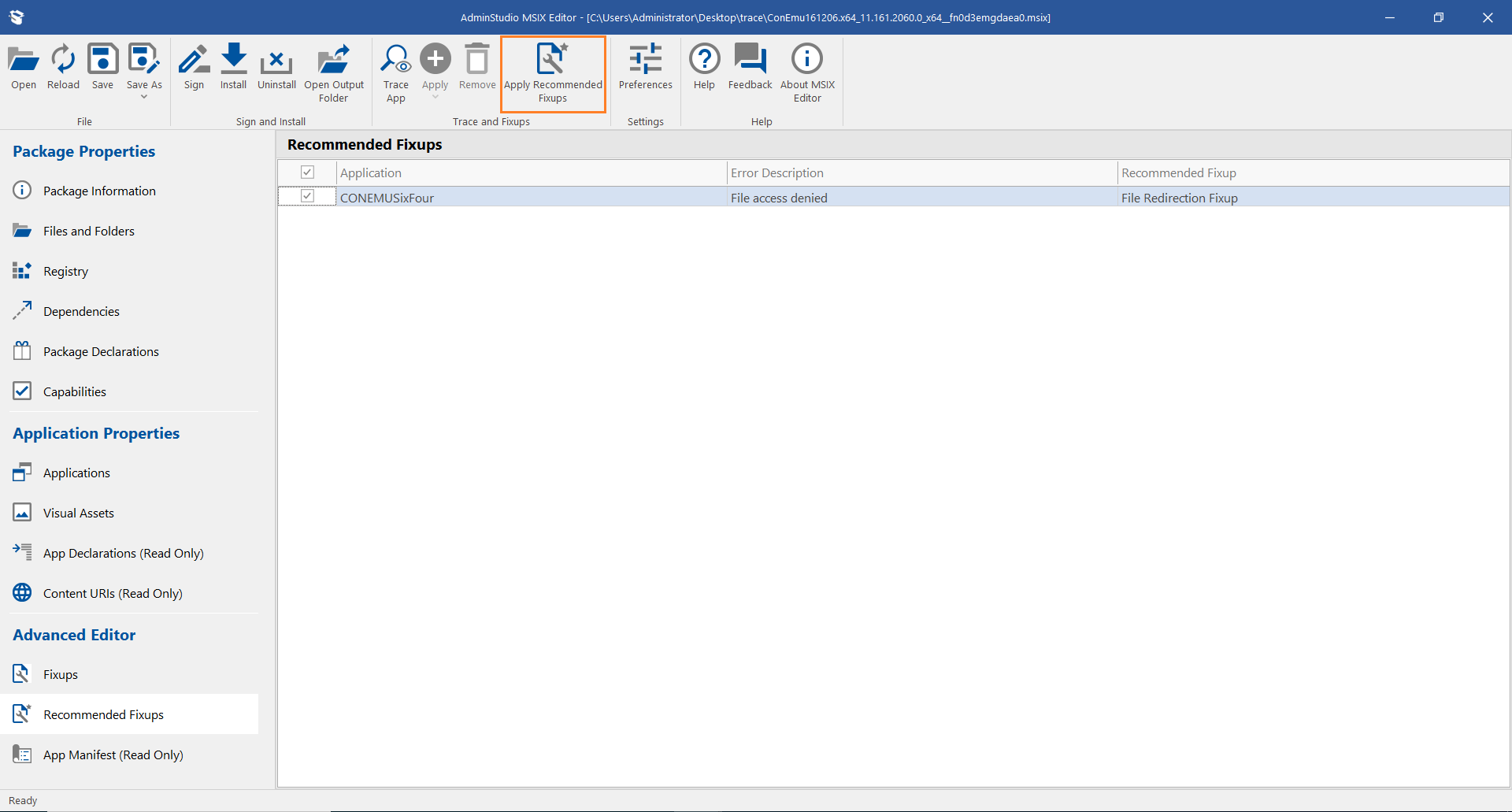 6. Select the recommended fixups and click on Apply Recommended Fixups button in the ribbon. ![](/images/MSIX Editor_TraceApp_RecommendedFixup NewImage1.png)
