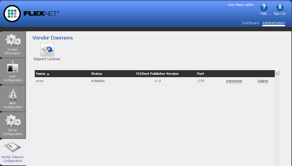 1. Click the Administration link, and then click the Vendor Daemon Configuration tab.